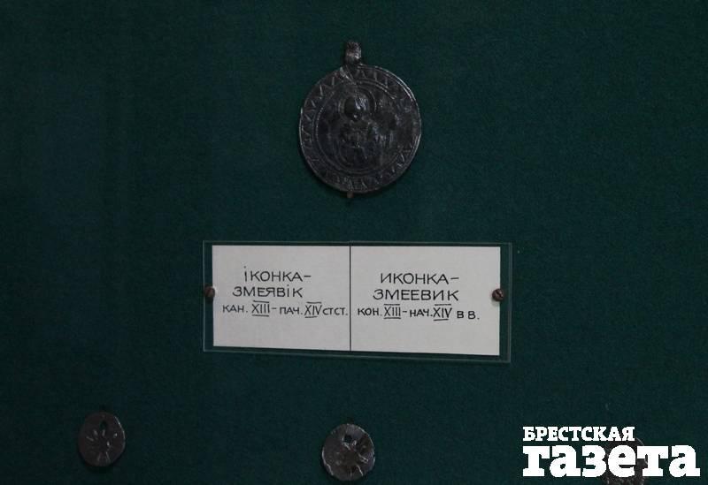 Привлекла внимание иконка-змеевик, на лицевой стороне которой изображена Богородица Знамение и маленькая фигурка Иисуса Христа у пояса. На оборотной стороне иконки — изображение бычьей головы с отходящими от нее на длинных тонких змеиных туловищах 12 змеиных голов (отсюда и название «змеевик»). Змеевик имел значение амулета, оберега, защищавшего своего хозяина от болезней, бед и несчастий. Присутствие на одной иконке одновременно христианских и языческих символов говорит о том, что в ХIII веке языческие представления окончательно не отжили.