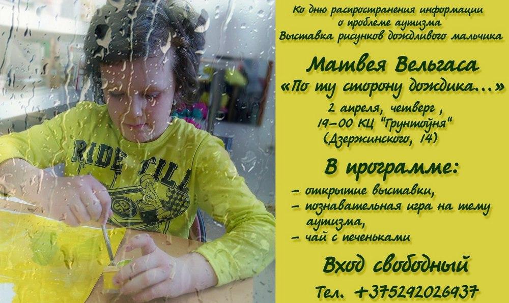 На выставке «По ту сторону дождика» представлены рисунки Матвея Вельгаса — мальчика с диагнозом «аутизм». «Цель этой выставки не столько продемонстрировать, как красиво рисует Матвей, сколько показать, что люди с аутизмом не просто замкнуты в себе, а тоже творят, чувствуют и способны к созидательному творчеству, — рассказала мама мальчика Ольга Вельгас. — Она рассчитана не на специалистов, не для родителей с такими детьми, потому что мы про них и так много знаем. А на всех остальных людей, которым мы протягиваем руку и говорим «Давайте дружить!»