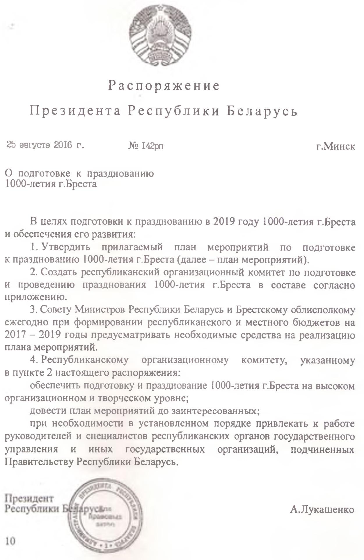 Среди прочих пунктов глава государства поручил Совету министров и Брестскому облисполкому ежегодно при формировании республиканского и местного бюджетов на 2017 — 2019 годы предусматривать необходимые средства на реализацию плана мероприятий, приуроченных к тысячелетнему юбилею города.