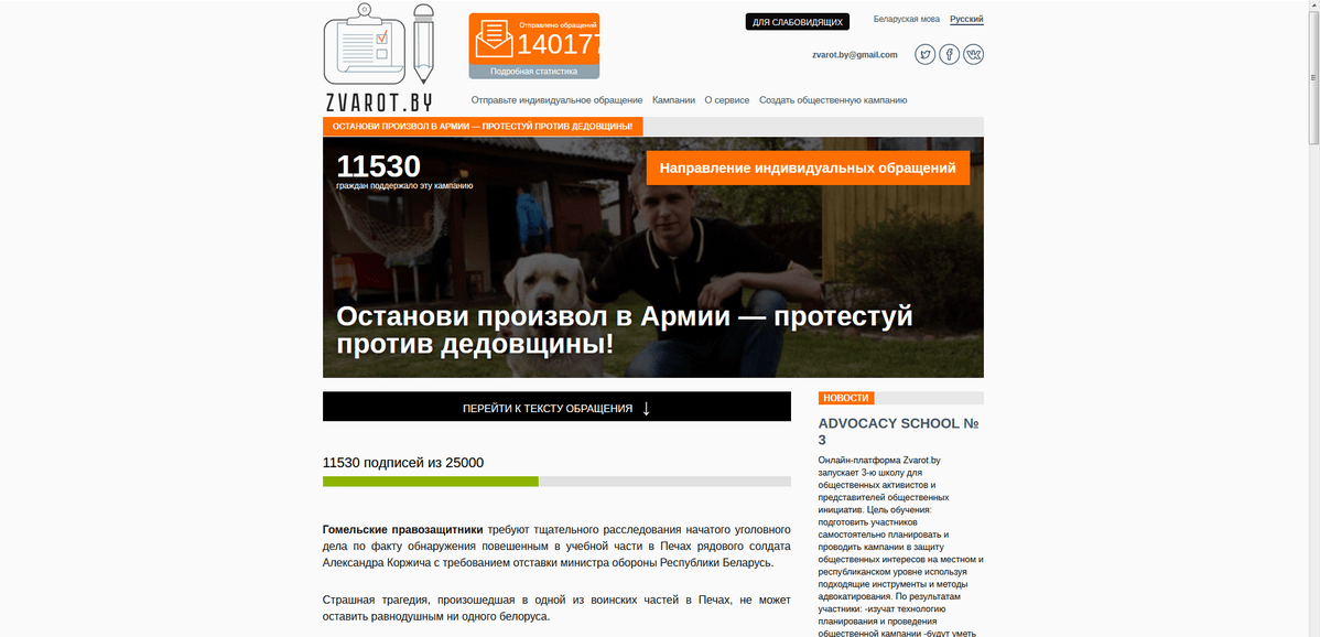 Напомним, электронное обращение было отправлено в четыре госоргана 18 октября. В нем содержится требование тщательного расследования начатого уголовного дела по факту обнаружения повешенным в учебной части в Печах рядового Александра Коржича с требованием отставки министра обороны Андрея Равкова.