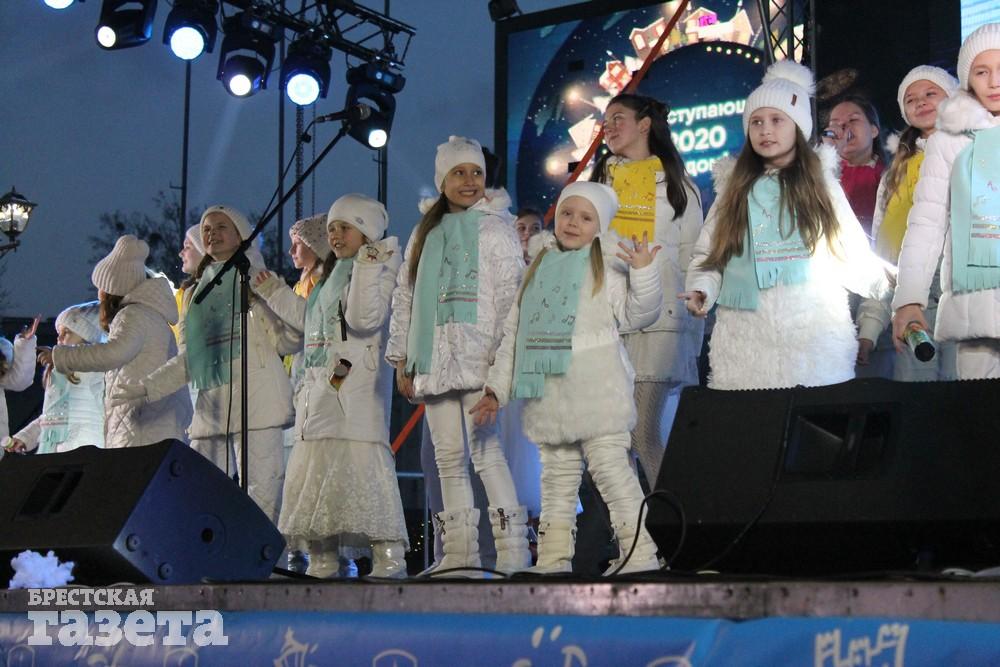 Для зажжения главной новогодней елки города на сцену пригласили председателя Брестского горисполкома Александра Рогачука, который сделал это в компании преданного фаната ФК «Динамо Брест» Никиты Полуянова и легендарного футболиста брестского футбольного клуба Романа Василюка.