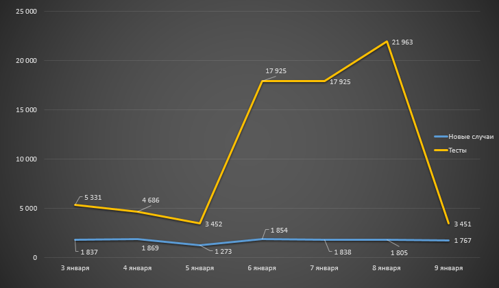 Всего с 3 по 9 января медики провели 74 733 теста на наличие COVID-19. При этом их ежедневное количество варьировалось от 3 451 до 21 963.