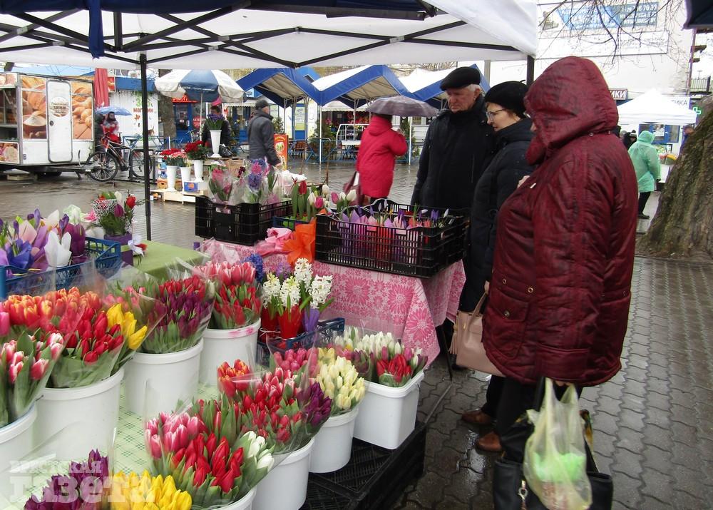 Торговцы цветами возле Брестского рынка продают в основном тюльпаны. Пока не видно ни мимоз, ни хризантем.
