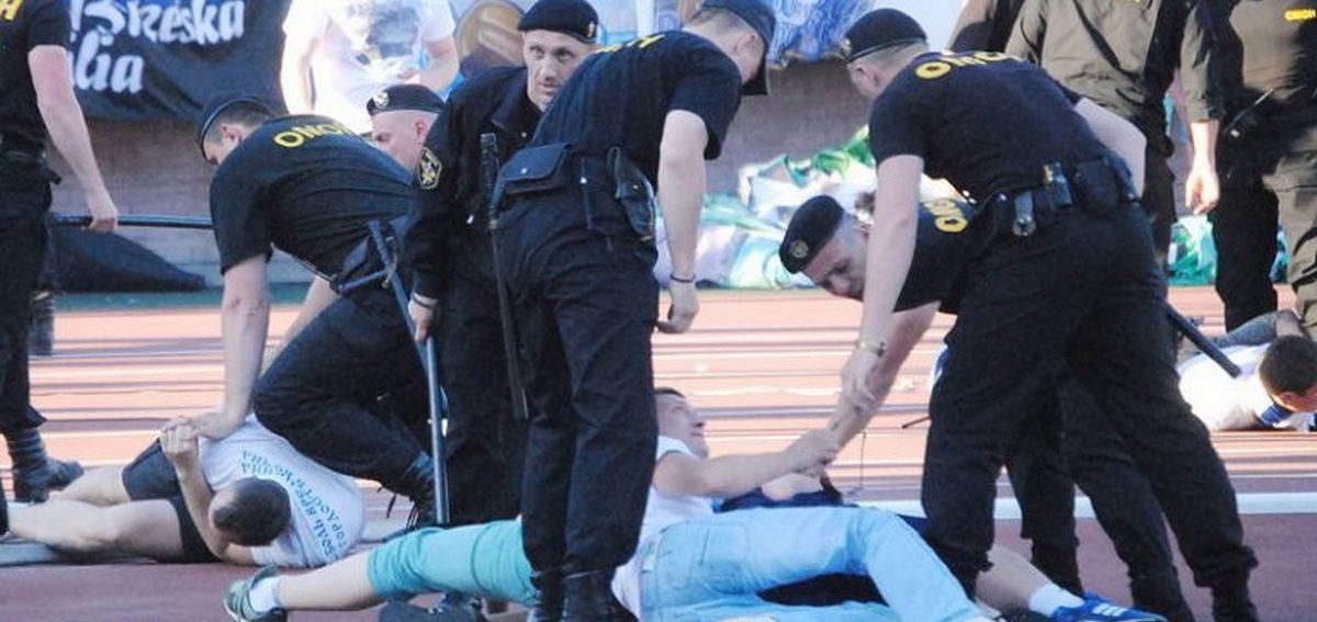 После победы брестского «Динамо» над солигорским «Шахтером» на гродненском стадионе фанаты брестчан прорвались на поле, некоторых из них омоновцы силой уложили на землю.