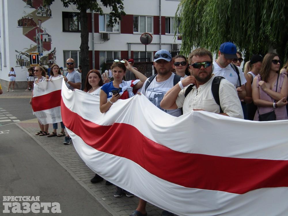 Собравшиеся люди растянули длинный бело-красно-белый флаг и выстроились в цепь. Часть брестчан пришла с флагами стандартного размера.