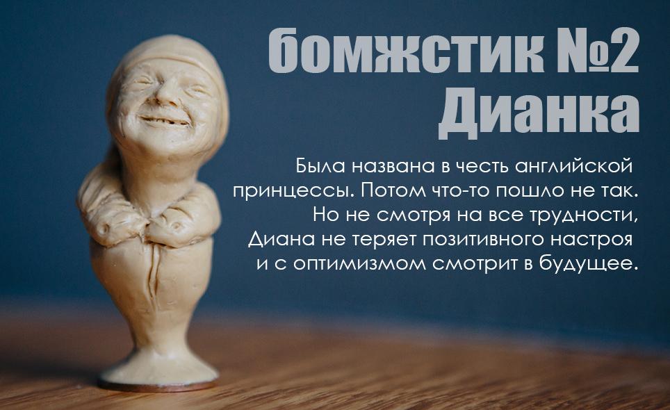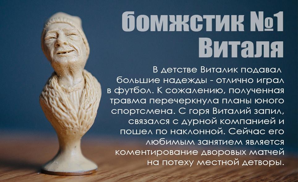 У бомжтиков есть биографии. Например, пишет дизайнер, бомжстик Боря «в молодости слыл интеллектуалом. Внешняя схожесть с актером Валентином Гафтом сыграла с ним злую шутку. Люди часто приглашали его выпить (дабы быть ближе к искусству), а Боря был не в силах устоять перед халявной выпивкой». А бомжстику Витьку «мама говорила: «Не свисти — денег не будет!» Теперь, не обремененный финансовыми проблемами, Виктор может свистеть день напролет и ничего не опасаться. Жизнь хороша, когда свистит душа! Так держать, Витя!»