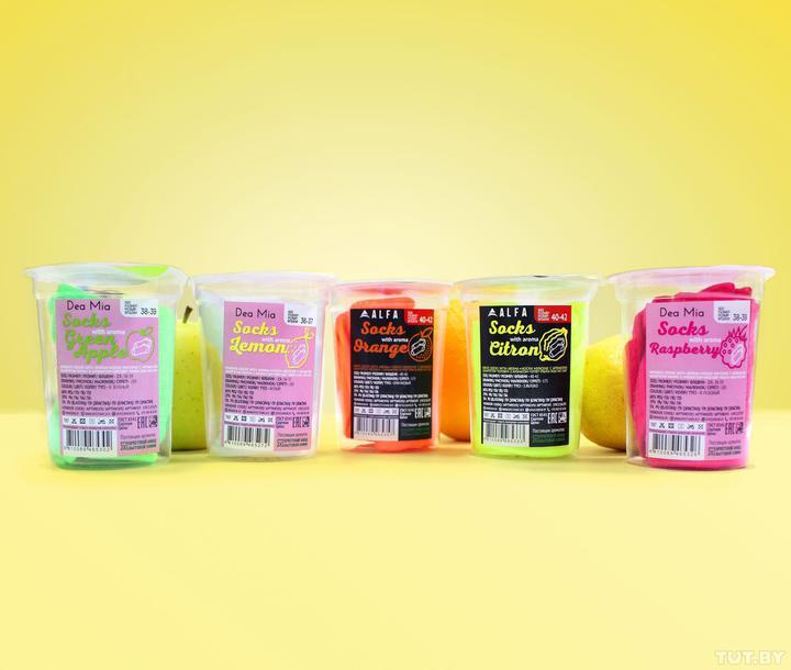 В новой линейке пять ароматов и столько же цветов. Салатовая пара — с запахом зеленого яблока, белые пахнут лимоном, оранжевые — апельсином, ярко-желтые — цитроном, розовые — малиной. Носки упакованы в банки, по форме напоминающие упаковку для йогуртов или желе. Как рассказал порталу директор «БЧК» Сергей Жевнерович, запах продержится только до первой стирки.