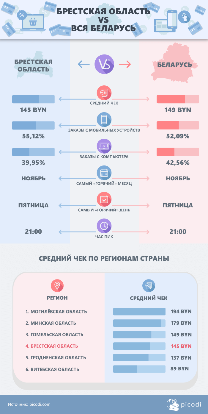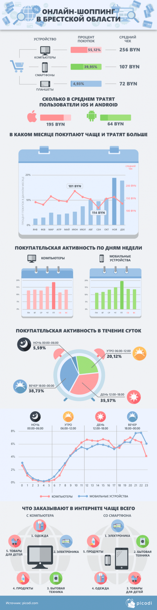 Пользователи в Бресте и Брестской области охотно покупают одежду и электронику. При помощи компьютера часто заказывают бытовую технику и продукты питания, а со смартфонов — товары для детей.