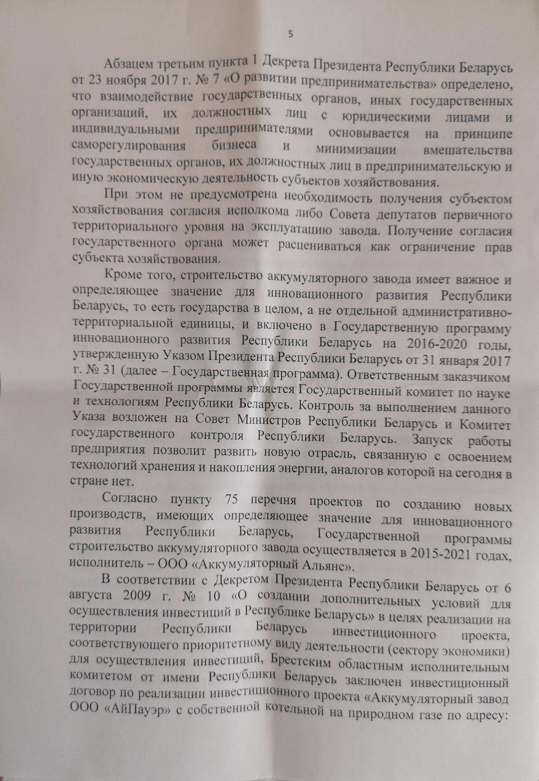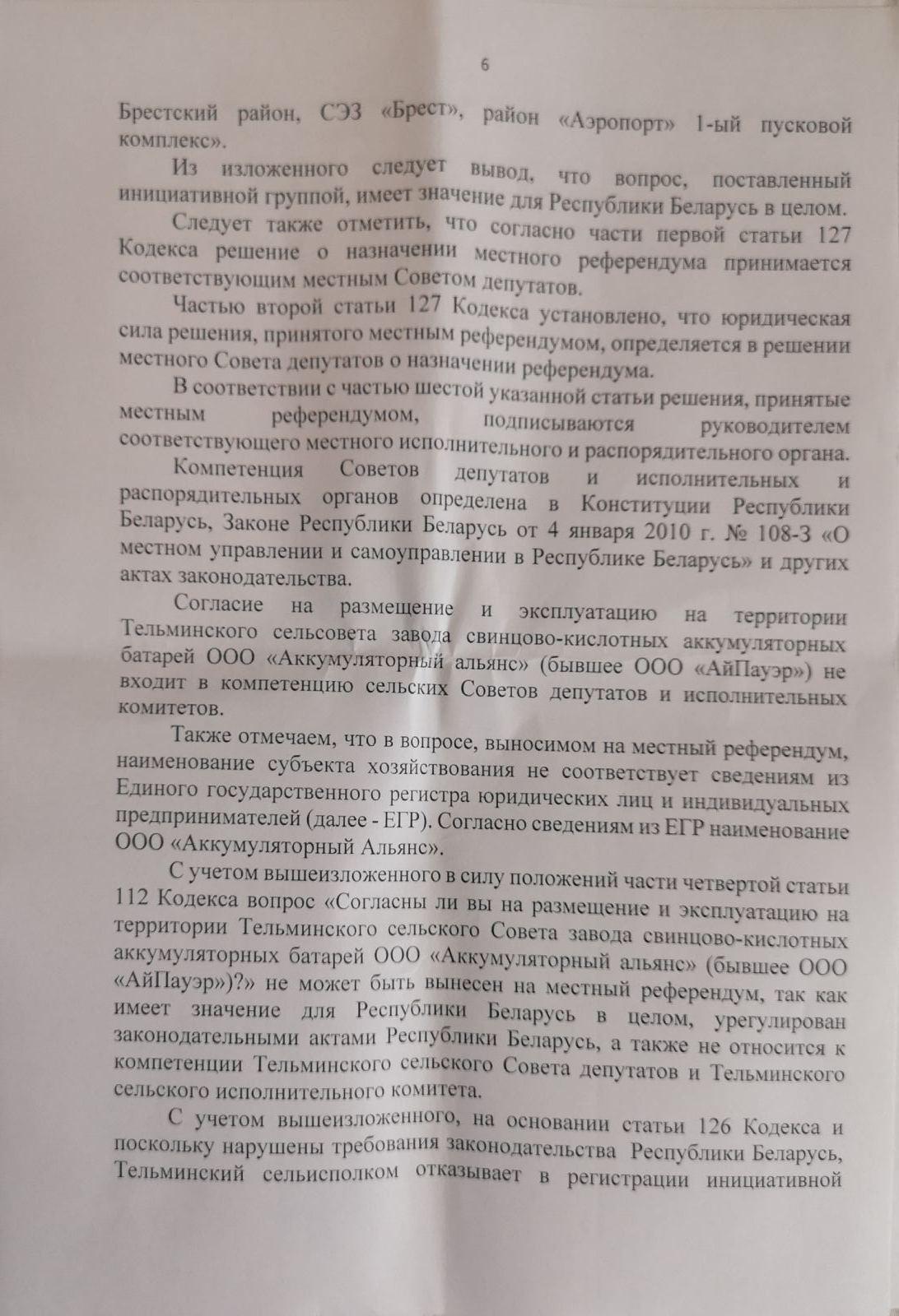 В отказе, который занимает семь листов, говорится, что в целом порядок образования инициативной группы соблюден, однако вопрос, выносимый на референдум, не соответствует требованиям законодательства – в компетенцию сельисполкома не входит вопрос размещения и эксплуатации предприятия, имеющего значение для всей страны. К слову, именно с такой формулировкой в регистрации инициативной группы по проведению местного референдума еще в январе 2019 года активистам отказал Брестский райисполком.