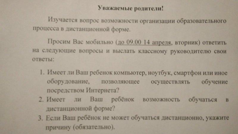 А в Беларуси подходят к концу затянувшиеся каникулы и, если их опять не продлят, уже через несколько дней начнется четвертая четверть. Однако на текущей неделе классные руководители начали проводить среди родителей опрос о возможности дистанционного обучения школьников. В частности, родителей просят ответить на вопросы о наличии у ребенка гаджета, необходимого для онлайн обучения: компьютера, ноутбука, планшета или др.