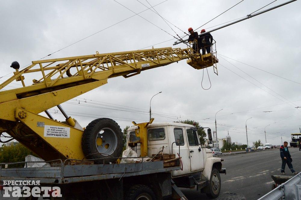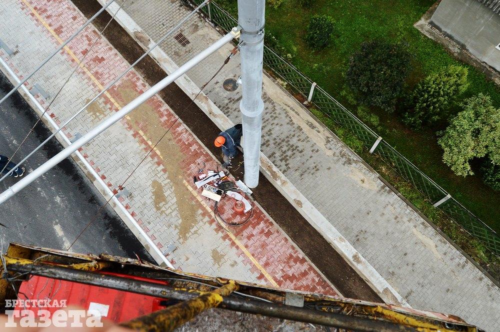 Днем 27 августа электромонтеры крепили тросы для поддержки троллейбусных линий. Ночью с понедельника на вторник протягивали их над новой полосой движения.
