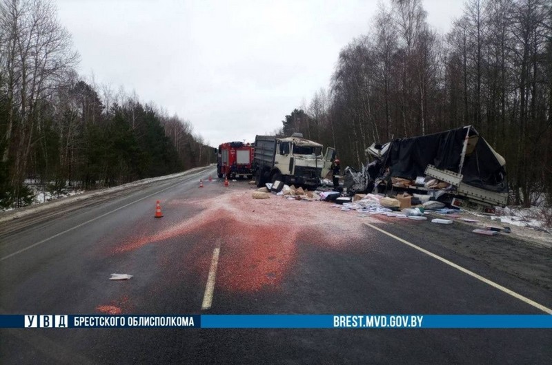 Происшествие случилось днем 25 января. По предварительной информации, 51-летний водитель МАЗ ехал по трассе М10 «Гомель — Кобрин». На 506-м километре дороги у автомобиля лопнуло колесо, поэтому он выехал на полосу встречного движения и врезался в грузовик Renault Master, которым управлял 27-летний водитель.