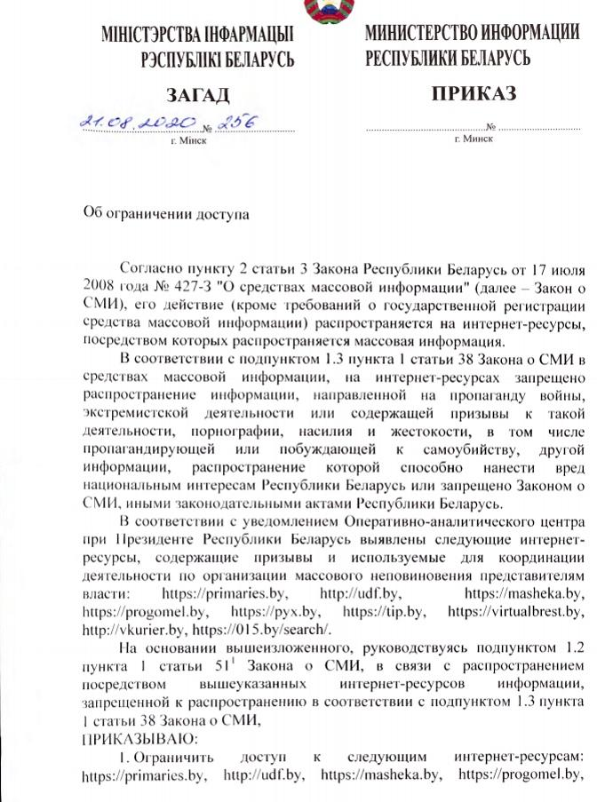 Читайте также: «На основании решения Мининформа». В Беларуси ограничили доступ к нескольким десяткам сайтов (список)