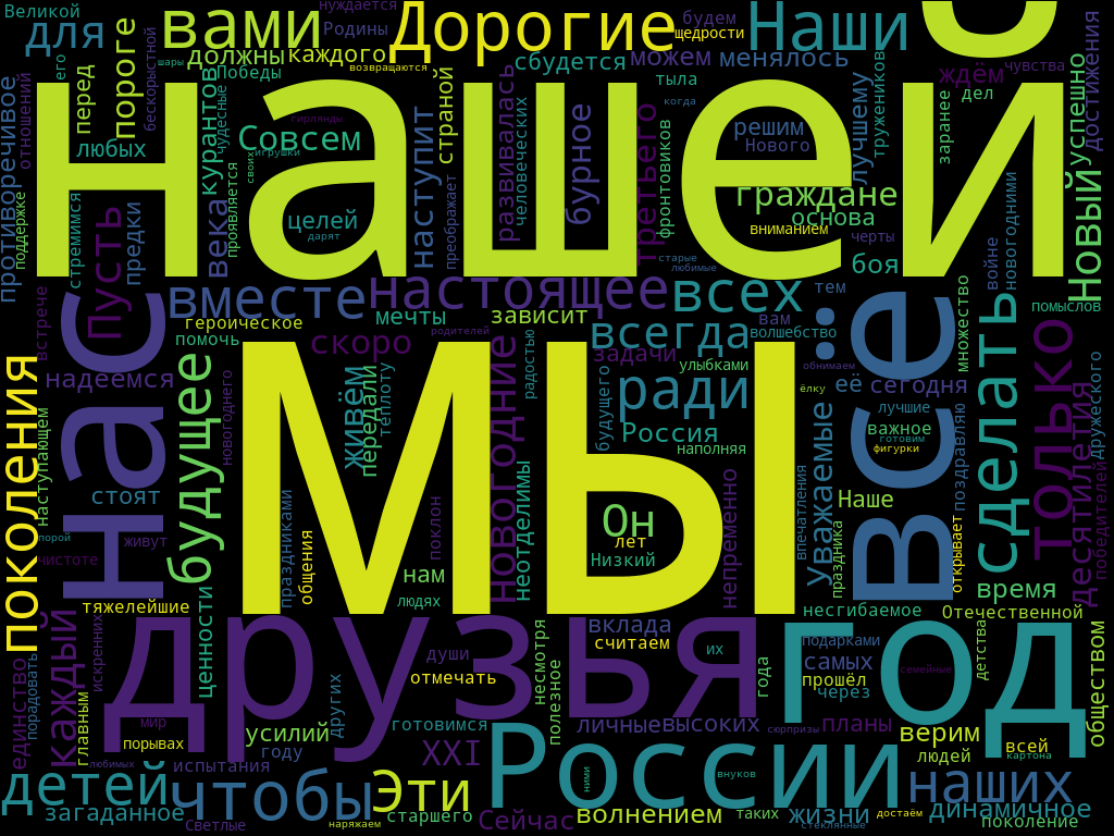Президент Беларуси Александр Лукашенко, глава Российской Федерации Владимир Путин и президент Украины Владимир Зеленский под бой курантов поздравил граждан и гостей страны с Новым 2020 годом. С помощью сервиса «Облако слов» мы посмотрели, какие слова чаще всего звучали в их речах.