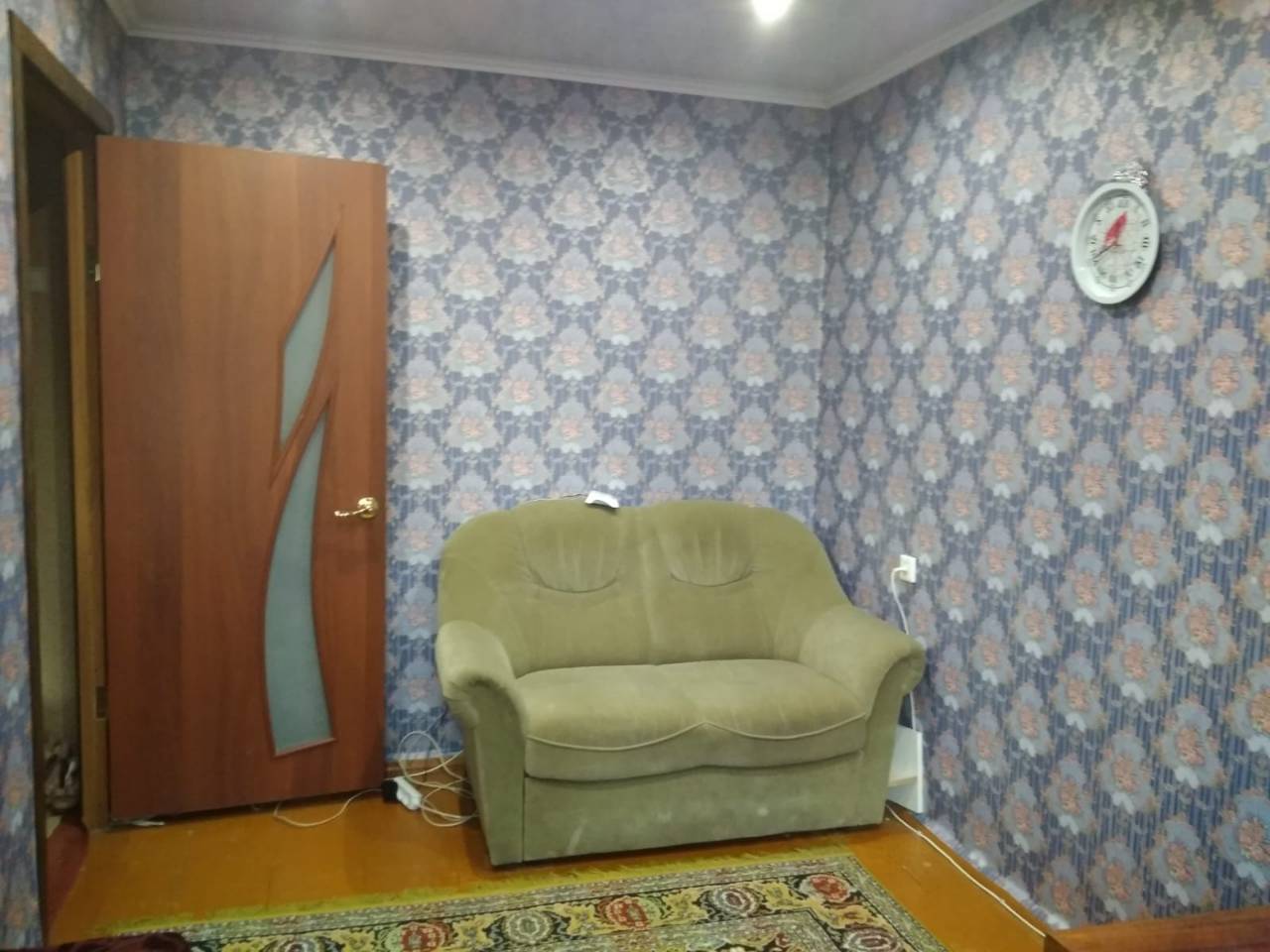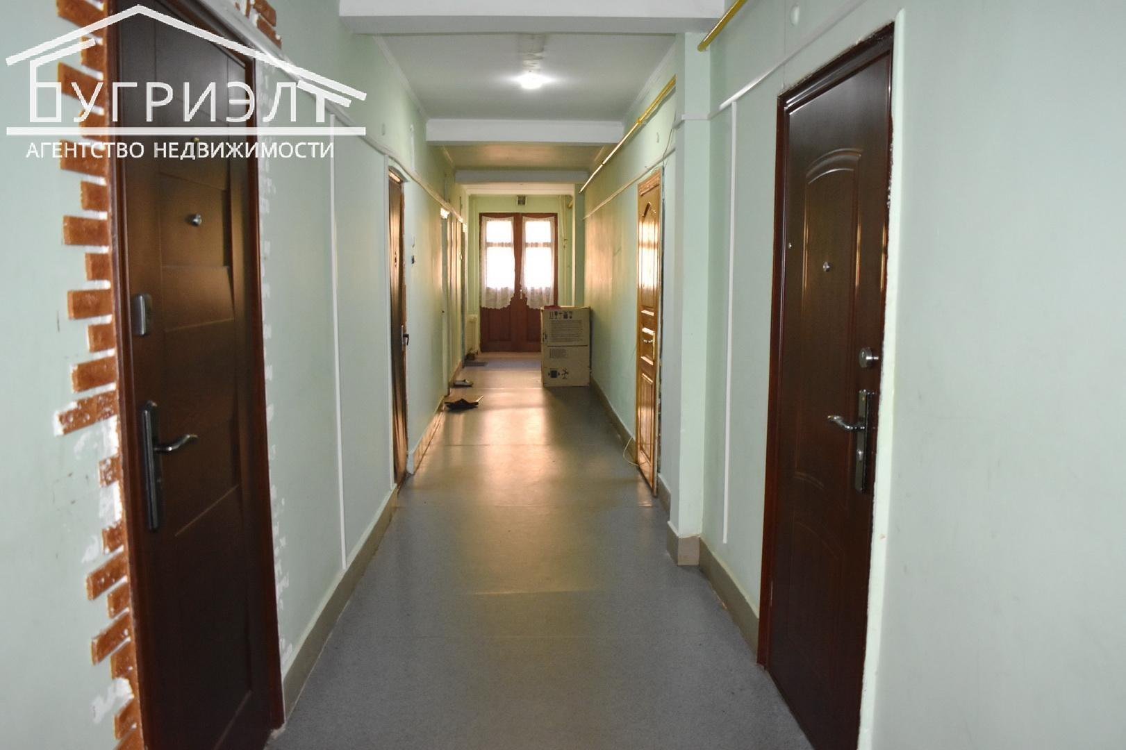 В квартире особенная планировка: большая жилая комната — в 19 кв. м находится напротив кухни и санузла. То есть, чтобы перейти из одного помещения в другое, надо выходить из квартиры в общий коридор.