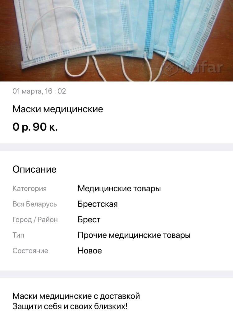 А этот парень из Пинска пошел еще дальше и заявил обычную маску как специальную от коронавируса. «Лучший защитник от короны и на стиле в черном цвете», – говорится в объявлении.