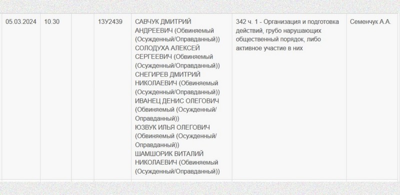 Во вторник, 5 марта, суд Ленинского района Бреста начнет судить по ст.342 УК (Действия, грубо нарушающие общественный порядок) шесть человек. Это Виталий Николаевич Шамшорик, Денис Олегович Иванец, Дмитрий Николаевич Снегирев, Дмитрий Андреевич Савчук, Алексей Сергеевич Солодуха и Илья Олегович Юзвук.