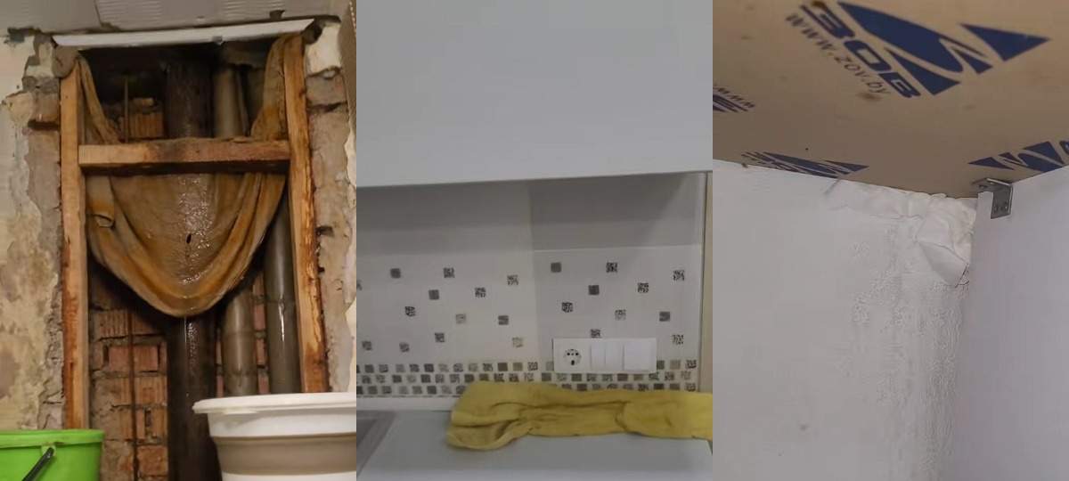 «Сёння 18 студзеня. З другога чысла выклікаем сантэхніка. Давялося разабраць палову туалета. Усё цячэ. Перайшло ўжо на ванную. Там крапае вада са столі. На кухні ад вады плітка пацьмянела. Там паўсюль выцякае вада. З выцяжкі таксама пачало крапаць. Пад сталешніцай таксама “прыгажосць”: даводзіцца затыкаць сурвэткамі, бо ўсё таксама цячэ па сцяне», — дзеліцца жанчына ў сваім роліку.