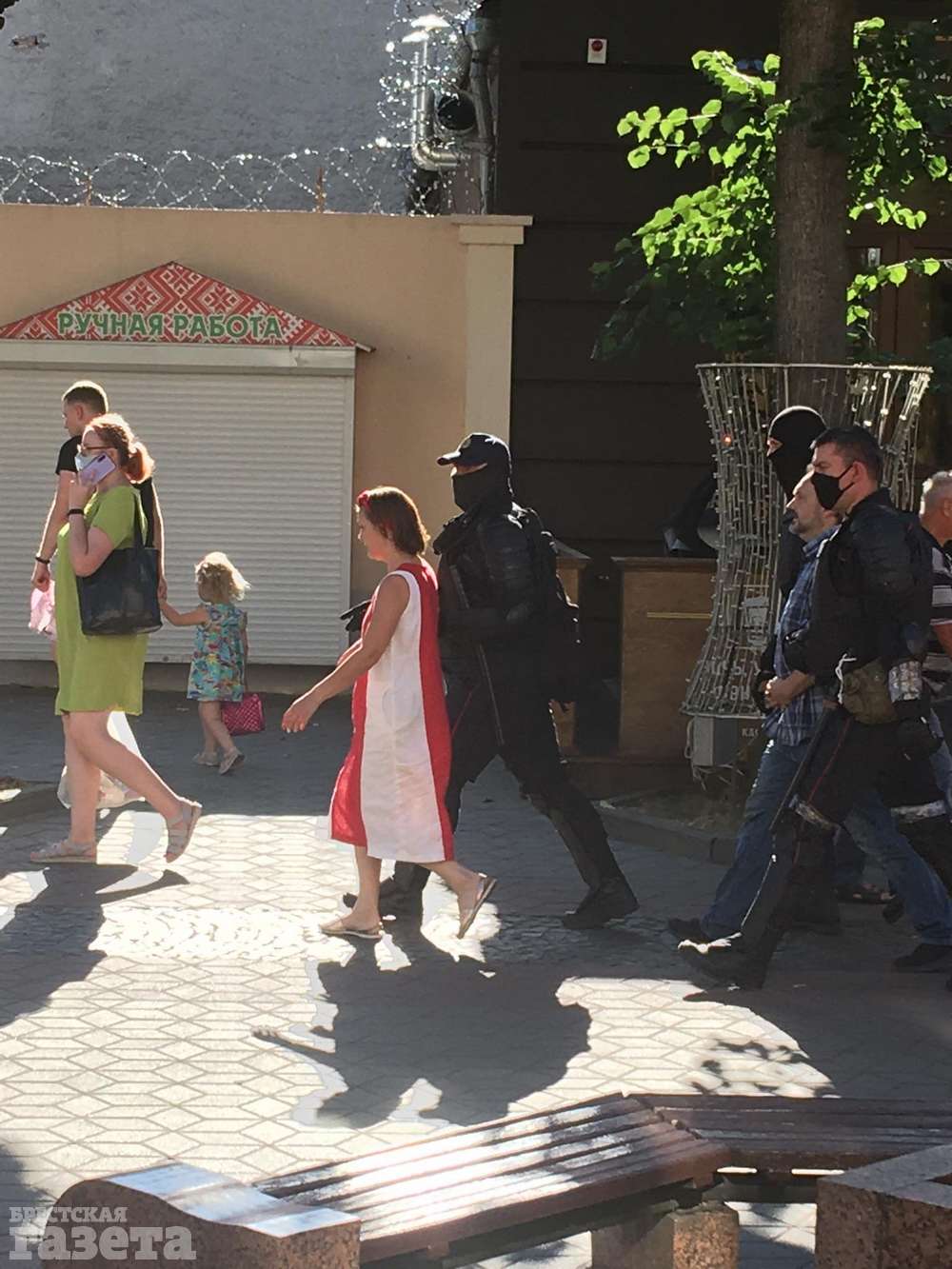 Она рассказала, что около 17.20 — 17.30 увидела силовиков, которые «бегали по парковке на улице Островского». В какой-то момент они, с ее слов, начали забегать в заведения. В том числе и в «Золотой мастер», откуда позже вывели Наталью Климович в красно-белом платье и «какого-то мужчину».