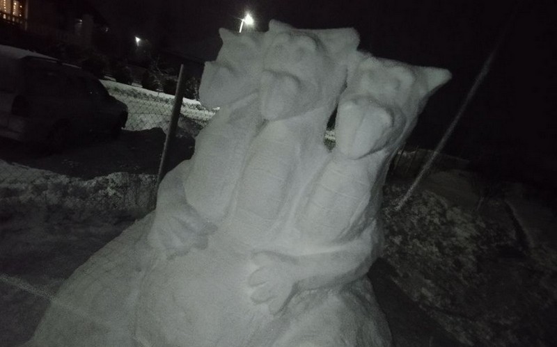 Огромную фигуру трехглавого сказочного персонажа Змея Горыныча вылепил из снега житель улицы Цветочной Александр Селивончик с дочерьми Дариной и Элиной, пишет газета «Наш край».