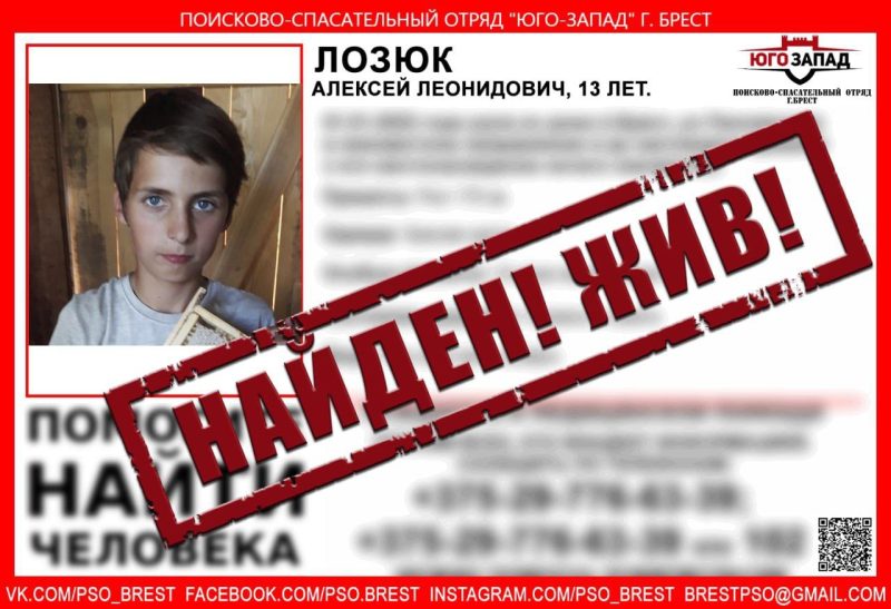 Но есть и хорошая новость. Спустя неделю после пропажи нашелся 13-летний житель Бреста Алексей Лозюк. Его обнаружили в городе Пушкино Московской области. Скоро мальчика передадут беларуским милиционерам, которые доставят его в Брест.