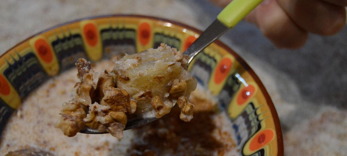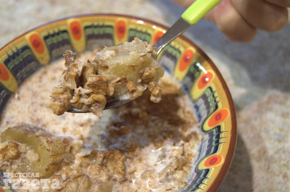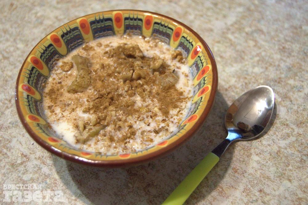 Надо (на 1 порцию): 1 банан, 70 г молока, 5-6 грецких орехов, 1 ч. л. корицы.