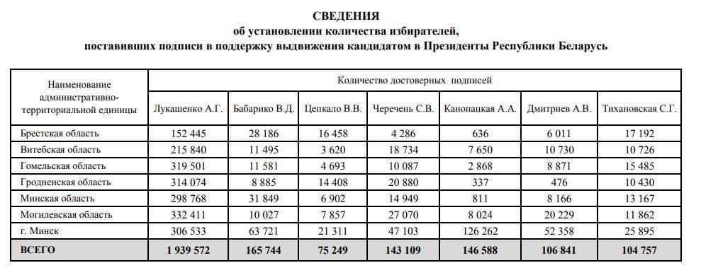 По данным ЦИК, после проверок у Валерия Цепкало из более 160 тысяч подписей осталось меньше половины — 75 249 подписей. У Виктора Бабарико действительными признаны 165 744 подписей, у Александра Лукашенко — 1 939 572, у Анны Канопацкой — 146 588, у Сергея Черечня — 143 109, у Андрея Дмитриева — 106 841, у Светланы Тихановской — 104 757.