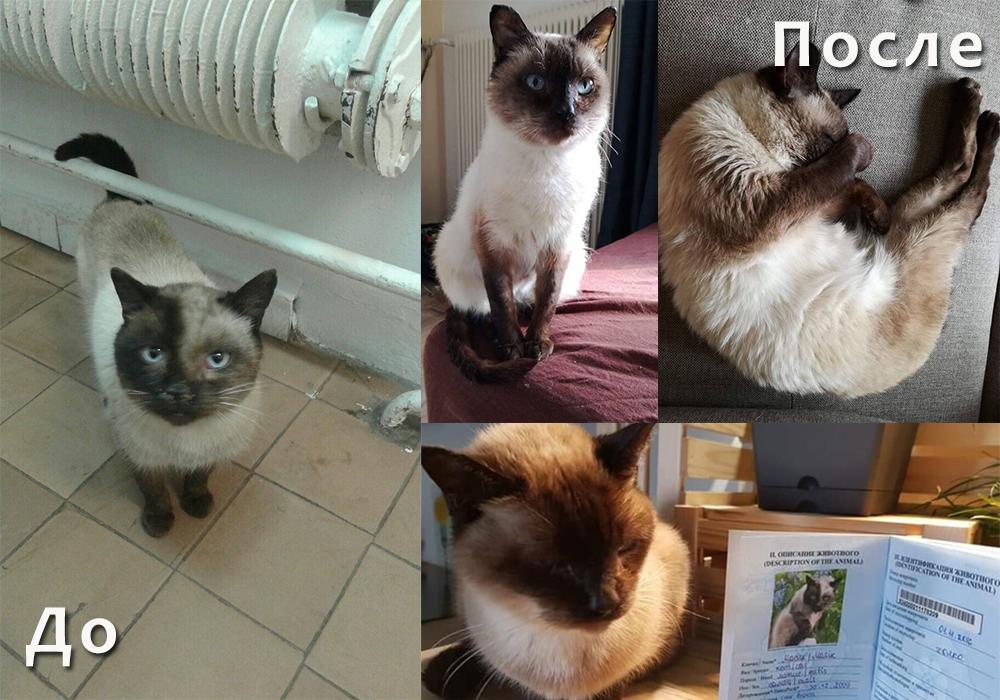 Еще один кот по имени Масик вытянул счастливый билет. Его нашли в 2016 году в Евроопте, где он все время жался к батарее. Кот был очень болен, мерз и голодал. На тот момент у него была особенность: половина мордочки темная, половина – светлая. Принцип сиамского окраса прост: чем холоднее зона тела, тем интенсивнее цвет. Половина мордочки «высветлилась» от сидения у батареи.