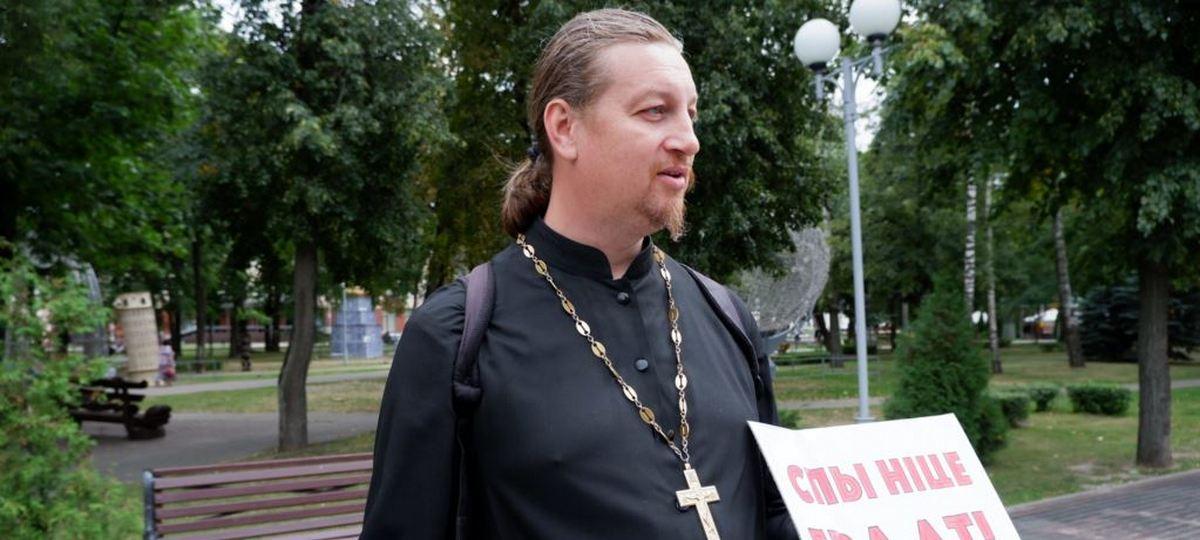 Бывший протоиерей Гомельской епархии неоднократно выходил на акции протеста, марши, 13 августа стоял с одиночным пикетом «Спыніце гвалт». Тогда он впервые протестовал в рясе.