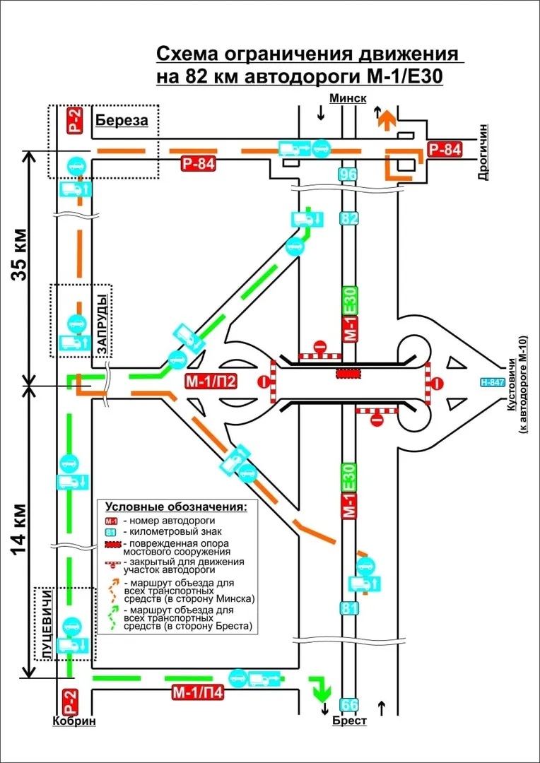 До восстановления прочности всей конструкции ГАИ и «Бреставтодор» организовали схему объезда. Автомобили, следующие в сторону Минска, должны будут съехать на трассу Р-2 и вернуться обратно на «олимпийку» через Р-84. А в сторону Бреста можно попасть через ту же Р-2 и еще одну подъездную дорогу М-1/П-4.