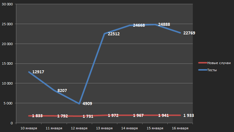 Судя по графику, за период с 10 по 16 января ежедневный прирост заболевших оставался примерно одинаковым, чего не сказать о проделанных тестах. Отметим, что эти два показателя взаимосвязаны и количество последних должно, по логике, влиять на число первых. Но по статистике Минздрава такая закономерность не прослеживается: рост количества проведенных тестов не дает увеличения числа выявленных инфекций.