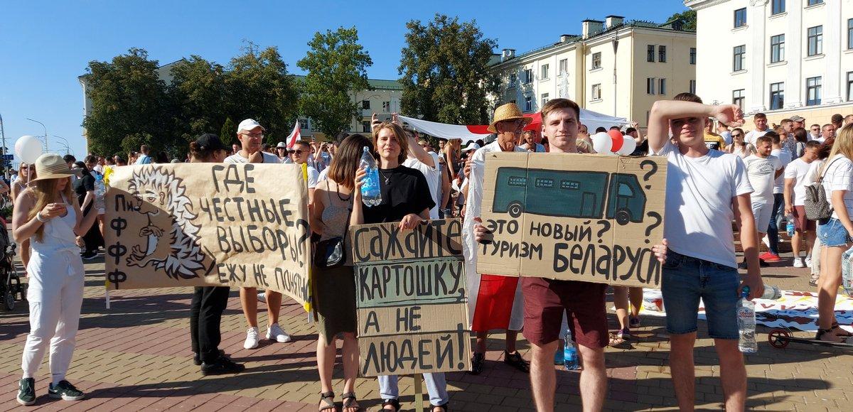 Последние два лозунга касаются Юрия Стыльского, лидера группы «Дай Дарогу!», которого задержали 15 августа после мирной акции протеста. Тот день музыкант провел в центре площади Ленина с развернутым бело-красно-белым флагом. По данным правозащитника Владимира Величкина, Стыльский находится в подвале Ленинского РОВД. Дежурный ему сказал, что Стыльский цел и здоров. По данным на 16.30, Юрий Стыльский был уже на свободе.