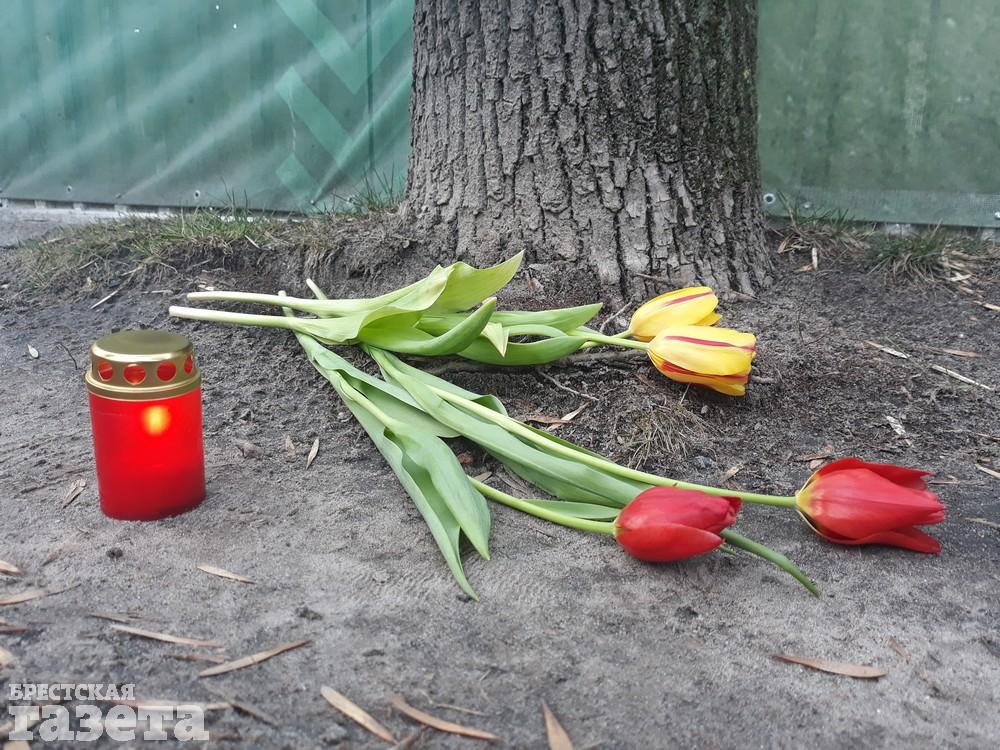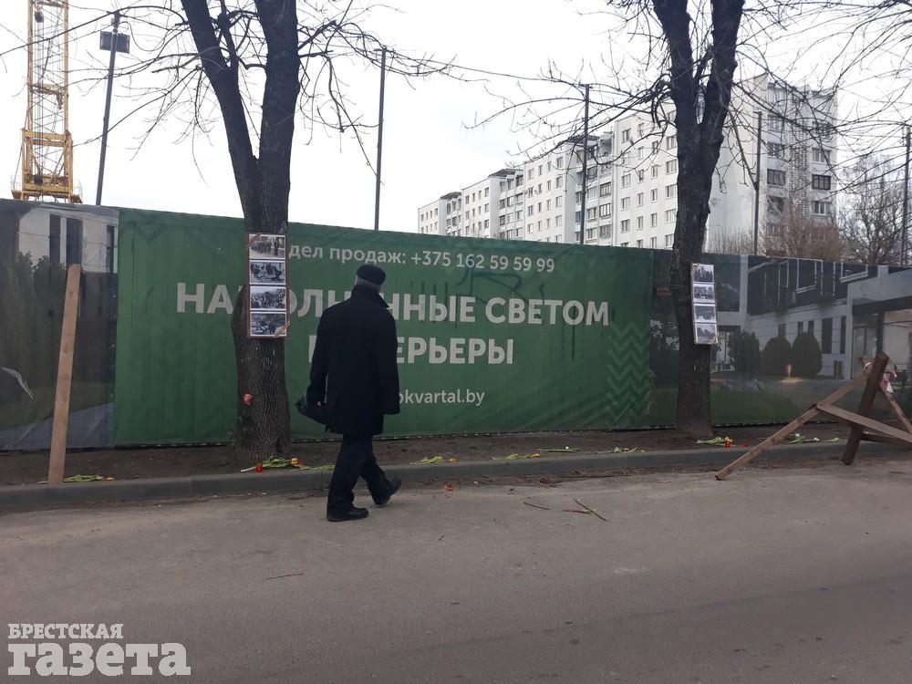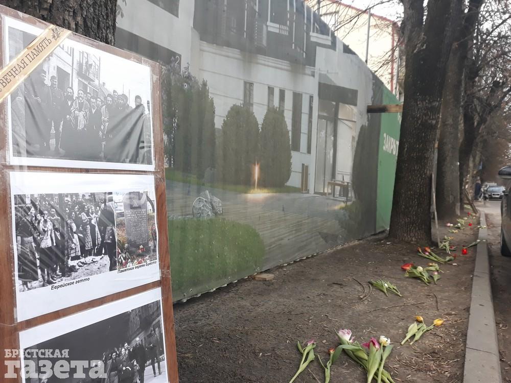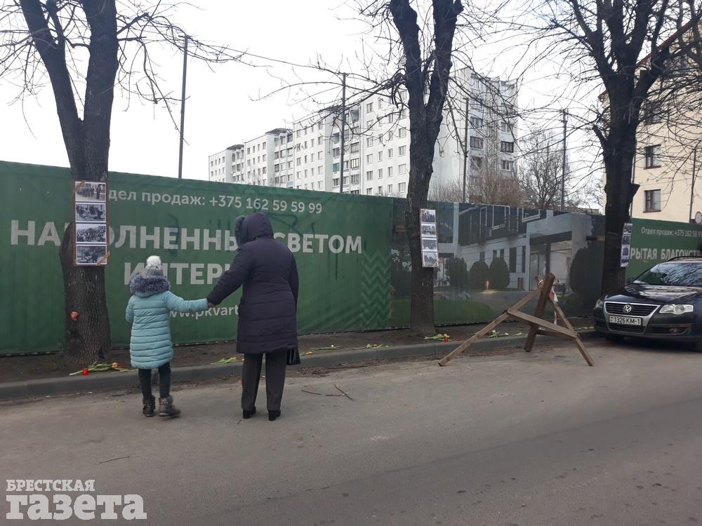 Вечером 11 марта брестский активист Виталий Казак принес к забору стройплощадки, на территории которой обнаружены останки сотен погибших людей, цветы, лампадки и фотографии евреев.