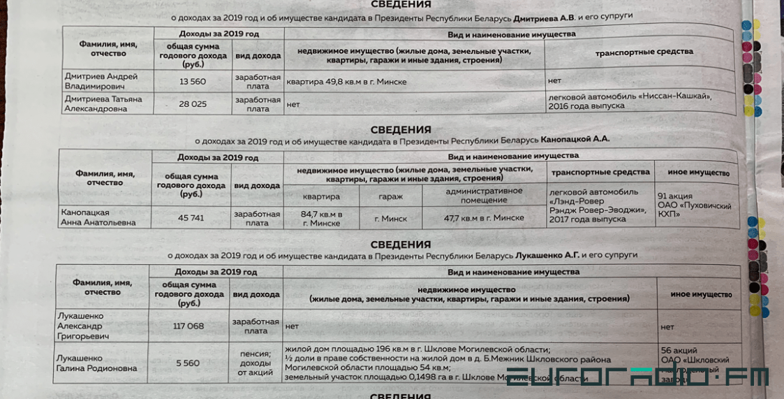 Доход баллотирующегося на шестой срок Александра Лукашенко за 2019 год составляет только его заработная плата — 117 068 рублей в год (или 9 755 рублей в месяц — это чуть меньше 5 000 долларов). Это отражено в декларации о доходах, которую он подал как кандидат в президенты. Данные опубликованы 14 июля в газете Администрации президента «СБ. Беларусь сегодня», пишет «Еврорадио».
