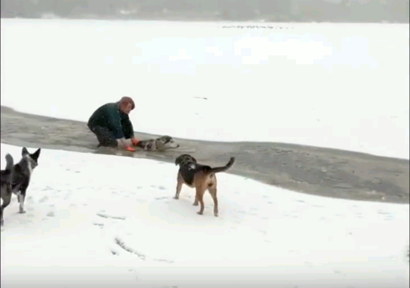 Собака бегала по замерзшему озеру и в какой-то момент провалилась под лед. Посетители парка, гуляющие недалеко со своими питомцами, стали звать пса. А одна из женщин, не раздумывая, бросилась на помощь псу. Она пробиралась к нему, разламывая лед руками. Отмечается, что это была не ее собака.