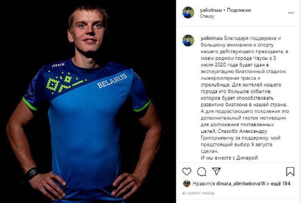 Биатлонист Роман Елетнов в посте на своей странице в Instagram поблагодарил Александра Лукашенко за помощь в строительстве биатлонного стадиона в Чаусах. Он написал, что уже выбрал, за кого будет голосовать на выборах президента 9 августа. Позже этот пост был удален.