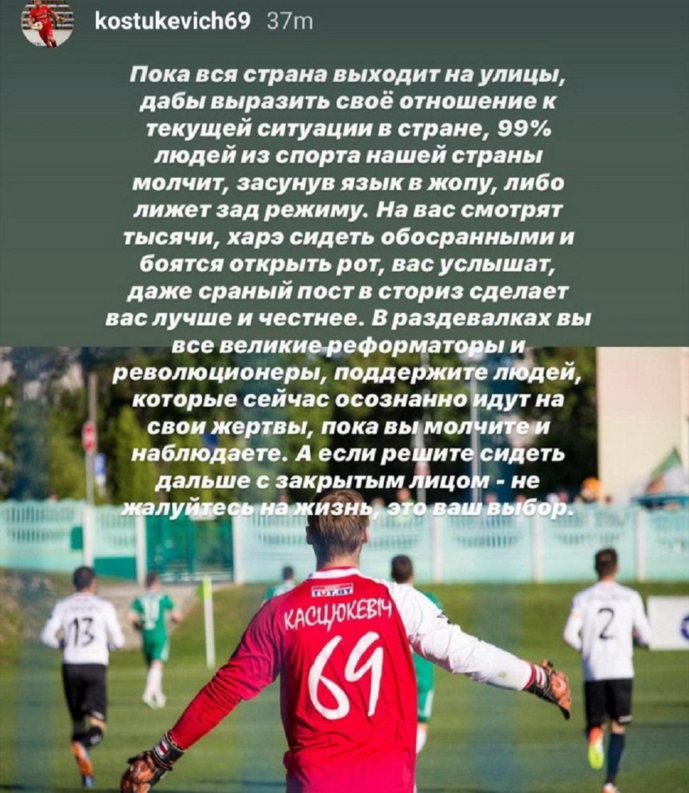 «Пока вся страна выходит на улицы, дабы выразить свое отношение к текущей ситуации в стране, 99% людей из спорта нашей страны молчит, засунув язык в жопу, либо лижет зад режиму. На вас смотрят тысячи, харэ сидеть обосранными и боятся открыть рот, вас услышат, даже сраный пост в сториз сделает вас лучше и честнее. В раздевалках вы все великие реформаторы и революционеры, поддержите людей, которые сейчас осознанно идут на свои жертвы, пока вы молчите и наблюдаете. А если решите сидеть дальше с закрытым лицом — не жалуйтесь на жизнь, это ваш выбор», — написал Евгений Костюкевич в Instagram (орфография и пунктуация сохранена).