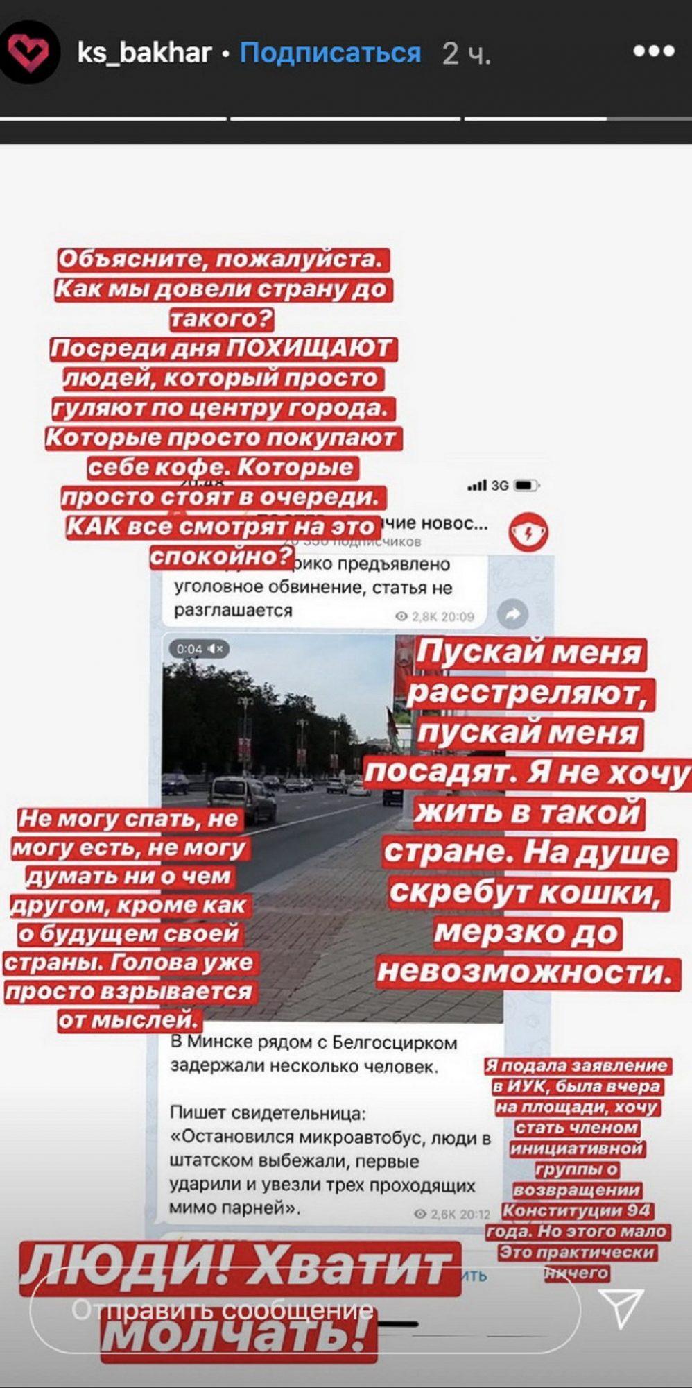 «Пусть меня расстреляют, пусть меня посадят. Я не хочу жить в такой стране. Мерзко до невозможности. Противно. Но не страшно. Уже не страшно. Ведь нас много, все видят и понимают поддержку друг друга. Такого еще не было никогда. Просто поколение выросло. Храброе поколение. Страна для народа, а не народ для страны. Мы победим», — написала Ксения Бахар на своей странице в Instagram.