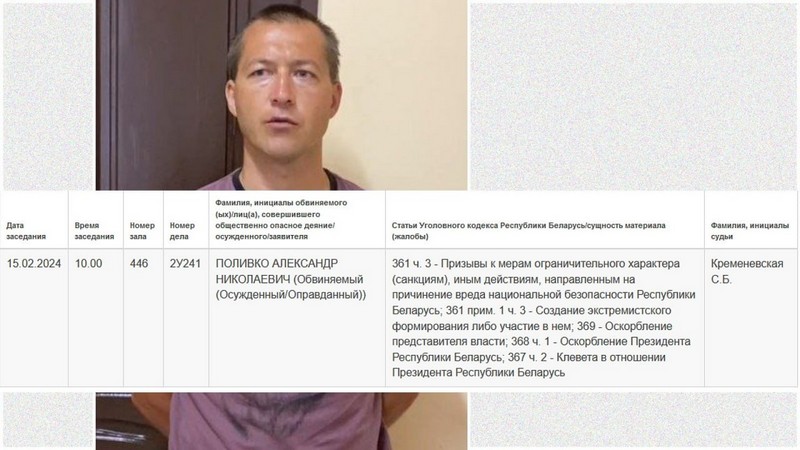 Брестский областной суд 15 февраля начнет рассматривать уголовное дело против жителя Лунинца Александра Поливко. Суд будет вести Светлана Кременевская. Информацию об этом на сайте суда заметила брестская «Вясна».
