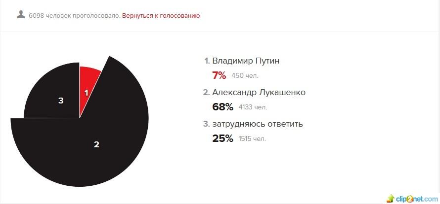 По состоянию на 21.40 четверга в сети проголосовало 3 693 человека. Из них за Путина в сети свои голоса отдали 216 человек (6%), Лукашенко — 2 458 человек (69%). Ровно четверть голосовавших – 885 человек – не определились с выбором.