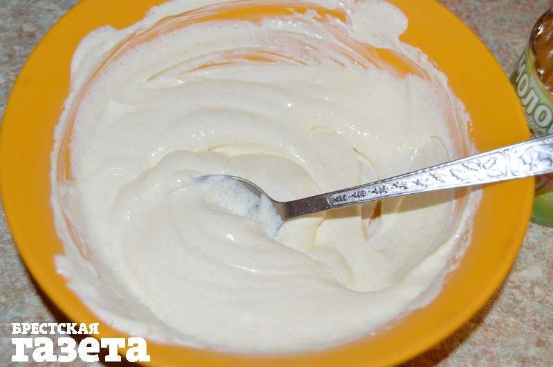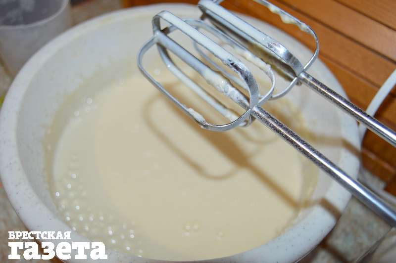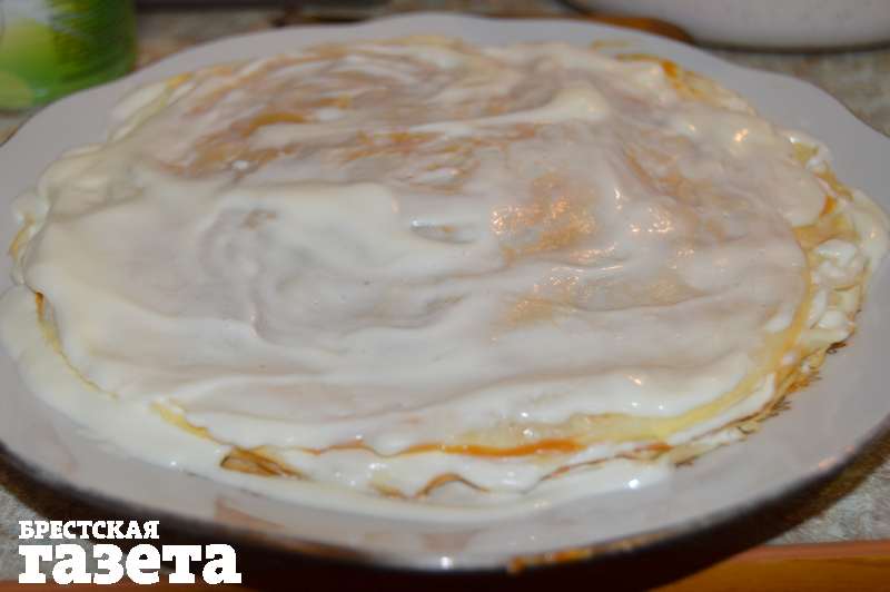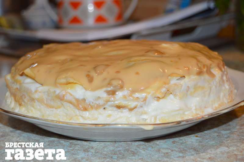 Надо для теста: 1,5 ст. молока, 1 ст. воды, 2 яйца, 2 ст. муки, 3 ст. л. сахара, 0,5 ч. л. соли, 1 ч. л. ванили, 2 ст. л. растительного масла; для начинки: 500 г сметаны, 2 ст. л. сахара, 250 г вареной сгущенки, орешки для украшения.