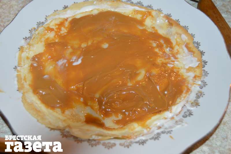 Соберите торт: каждый блинчик пропитайте начинкой — один блин сметаной, следующий сгущенкой.