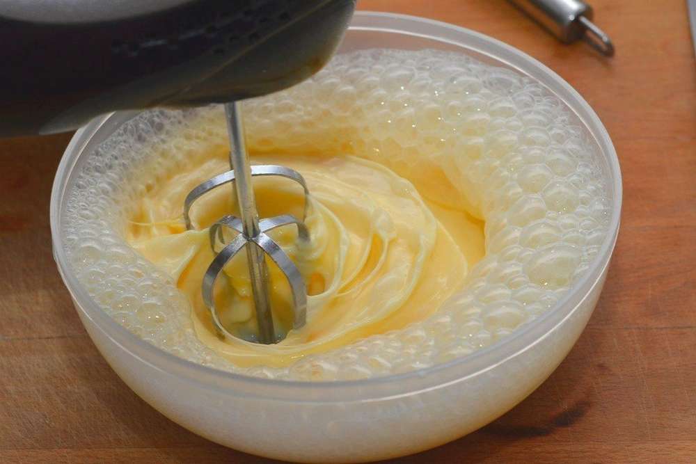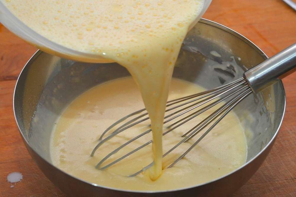 В отдельной емкости взбейте молоко и яйца. Вылейте половину молочной смеси в муку. Хорошо перемешайте до однородности. Добавьте охлажденное масло. Снова перемешайте. Введите оставшуюся молочную смесь и взбейте венчиком.