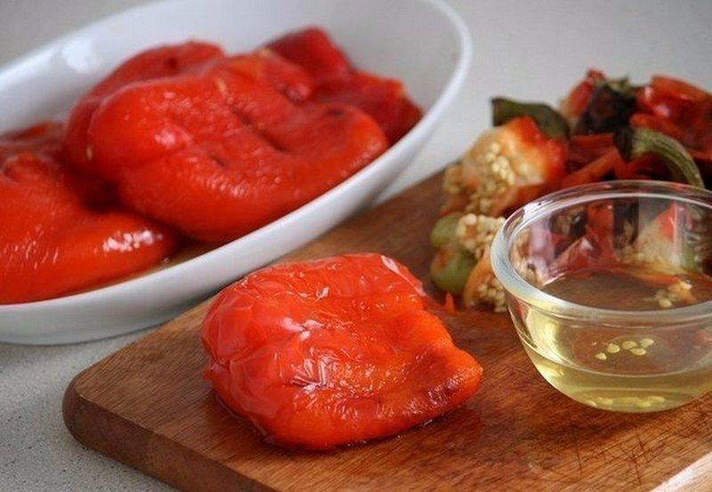 Готовим: Перцы вымойте и высушите. Положите на решетку и запекайте в духовке при температуре 200 градусов в режиме гриля 20 минут. Кожица на перцах должна вздуться и местами покрыться подпалинами.