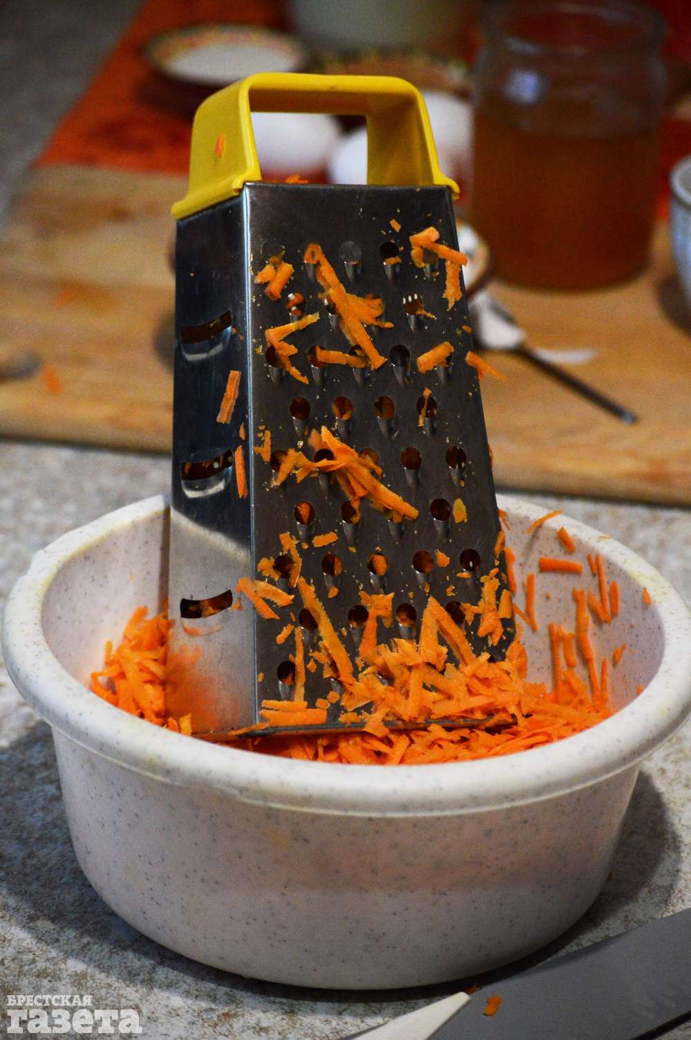 Готовим: Морковь очистите и натрите на крупной терке. У лимона натрите цедру и выжмите сок. Добавьте их к моркови. Затем в миску к моркови разбейте яйца, всыпьте корицу, соду, гашенную уксусом, и мед. Добавьте манку, все хорошо перемешайте и оставьте на полчаса, чтобы манка разбухла.