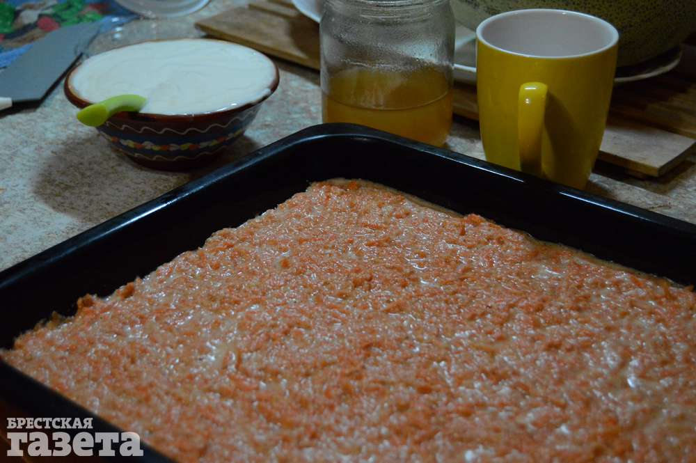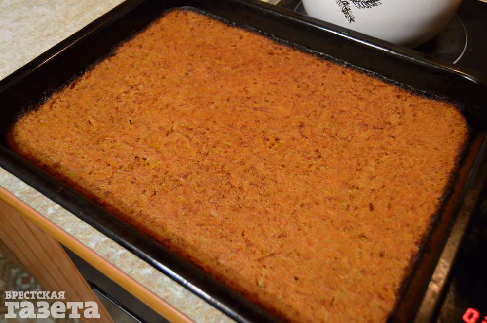 Большой прямоугольный противень смажьте растительным маслом и выложите туда морковное тесто. Выпекайте в духовке 50 минут при температуре 180 градусов. Готовность проверяйте зубочисткой.