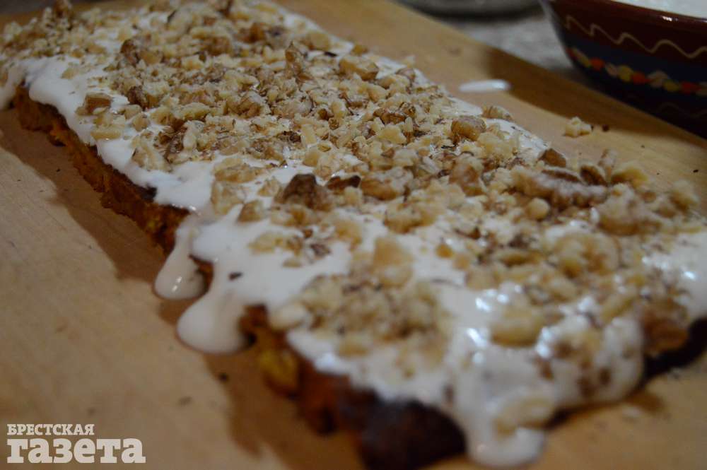 Испеченный корж разделите на три части. Каждую промажьте творожным кремом (творог, смешанный с медом) и посыпьте орешками, выкладывая друг на друга коржи слоями.