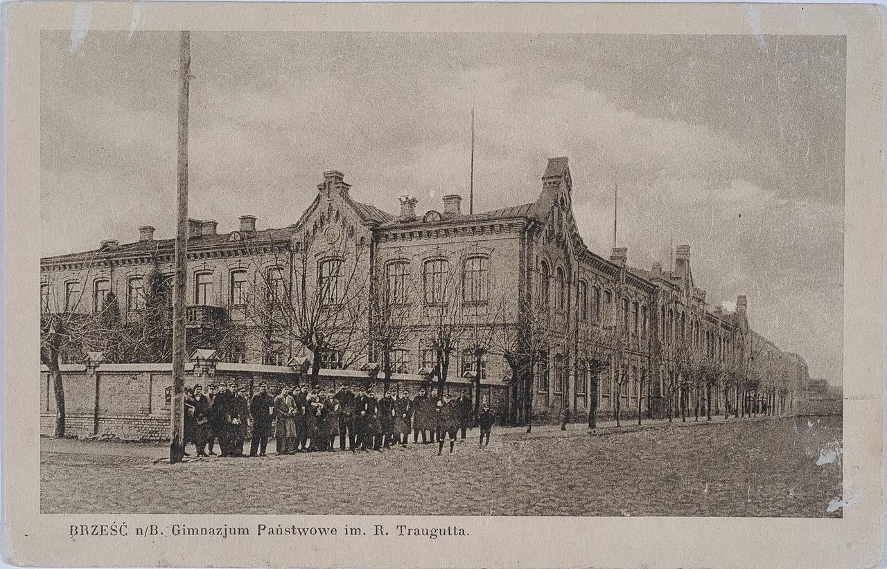 Здание бывшей мужской гимназии построено в 1903 г. в «кирпичном стиле» по проекту военного инженера А.Третьякова. Здание было двухэтажным, а в 1955 — 1960-х годах был надстроен третий этаж. С 3 марта 1921 года, когда Брест стал центром Полесского воеводства в составе Польши, в здании мужской гимназии разместилось наиболее престижное среднее учебное заведение полесского края — государственная гимназия имени Ромуальда Траугутта.