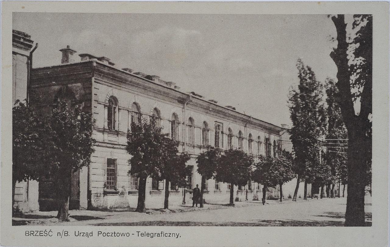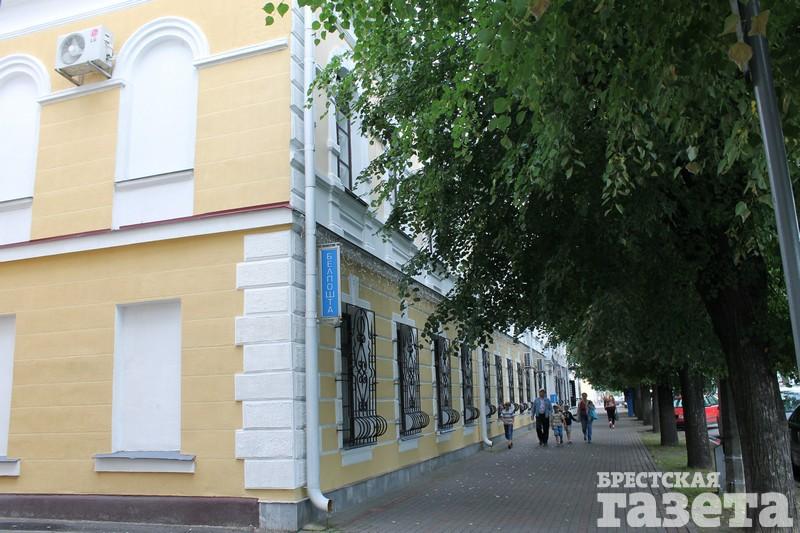 Одно из первых зданий, возведенных в «новом городе» в середине ХIХ в. в стиле классицизма. Постройки почтовой конторы занимали целый квартал. К зданию почты примыкало здание казначейства. За «польским часам» в здании почты находился Союз старых пожарных Полесского воеводства, а в здании казначейства — Спортивный клуб теннисистов. Почтовую контору описывал в своих путевых записках писатель и этнограф Шпилевский, проезжавший через Брест в 1853 году: «…в брестской станции можно с удовольствием отдохнуть, особенно после маленьких, незавидных станций польских. Какая чистота, какая опрятность, какой комфорт и роскошь во всем!»