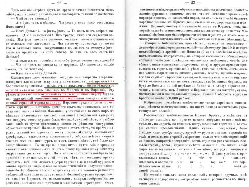 По свидетельству этнографа Павла Шпилевского, жившего в XIX веке, есть у этого места и куда более древняя история дохристианского периода. В своей книге «Путешествие по Полесью и Белорусскому краю», изданной в 1858 году, он пишет, что ему удалось взглянуть на археологическую редкость — огромный курган на правом берегу Мухавца, окруженный многочисленными насыпными копцами (так раньше называли невысокие курганы — прим. авт.) и наполненный странной формы камнями. Этнограф пишет: народное предание гласит, что этот курган — остаток древнего языческо-литовского или ятвяжского капища богини Мажанны, упоминаемой до сих пор (имеется в виду 1858 год — прим. авт.) в песнях и легендах местных жителей.